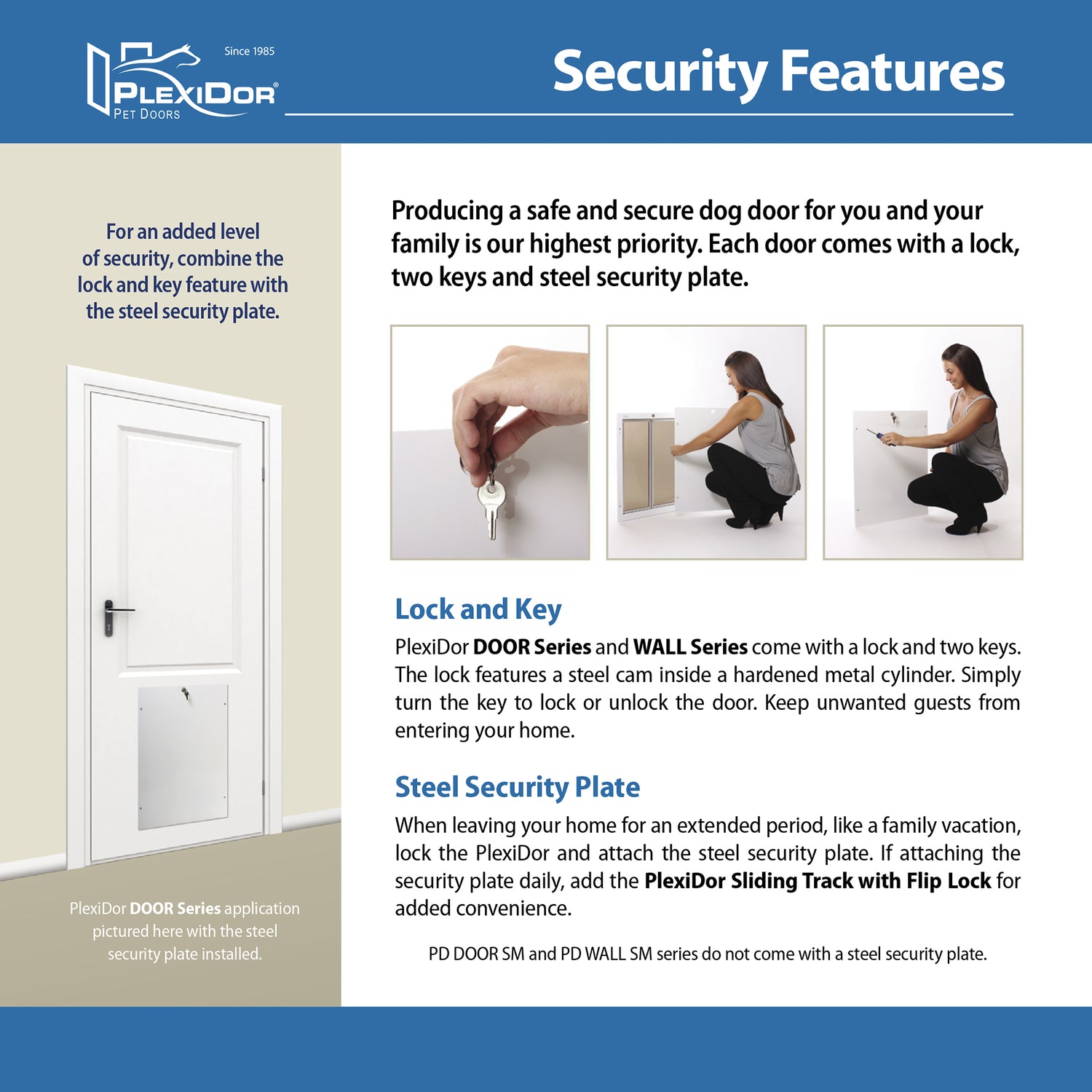 Medium, Large, and Extra Large PlexiDor include a cylinder lock, a key and a steel security plate. The door can be locked nightly and the steel security plate can be attached while you’re away for any extended period of time. PlexiDor Performance